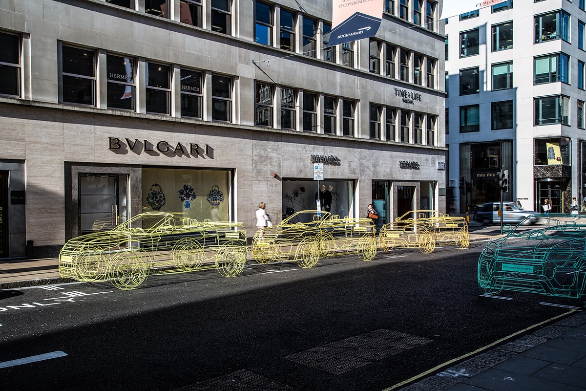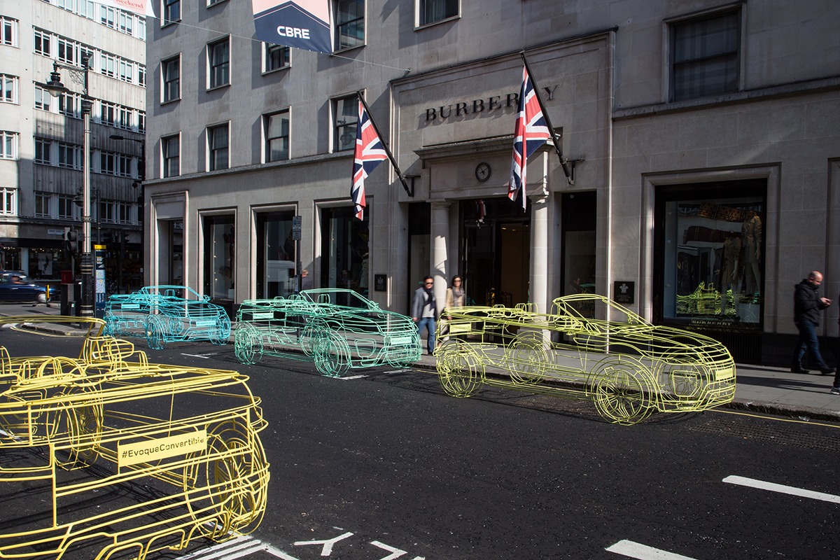 Cuma sabahı işe gitmek için yollara düşen Londralılar, Land Rover'ın satışına hazırlandığı Range Rover Evoque Convertible modelinin 3 boyutlu tarayıcıda tamamen tellerden yapılan ve bu yeni modelin dış görünüşünü potansiyel alıcılara tanıtmayı amaçlayan bir teaser sanat çalışmasıyla karşılaştılar.