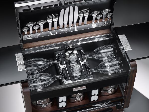 Süper lüks piknik sepetinin içinde de yine süper lüks gereçler yer alıyor. Sepetle aynı ceviz ağacından yapılan kesme tahtası, Rolls-Royce armalı peçeteler ve paslanmaz çelik çatal bıçak takımlarının yanı sıra, siyah ve platin renklerinde kristal şarap kadehleri ve tabaklar da bu süper lüks piknik sepetinin içinde yer alıyor.